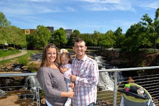 We got to Greenville after 5. Charlotte and I checked into the room in downtown then we went on a walk. We were bombarded by protesters at one point and then some kind of creepy middle aged guy at another. The middle aged guy came and sat near us as we were sitting by a fountain listening to music. He asks, "May I talk to your daughter?" I was like, "Ummm, yeah, that's fine." I mean, what was she going to say back??? So weird. After that I got out of there. Alex got to the hotel around 8 so he was able to play with Charlotte a bit before she fell asleep. SHE LOVES HER DADDY. She was so happy to see him. "Da Da" is what she kept yelling when we were sitting in the lobby waiting for him to pull up. Once he got there, we went upstairs and played and read books and talked and laughed. He and I ordered pizza and Charlotte fell asleep on his lap while we ate. It was a perfect night. We were asleep by 10:30.